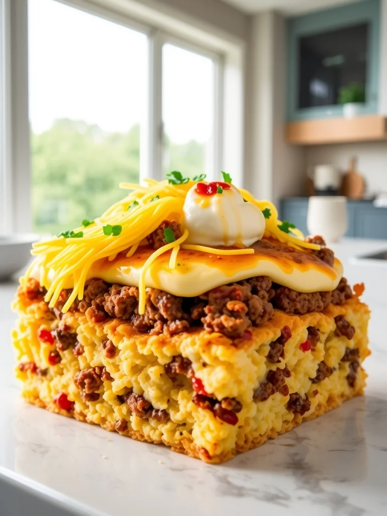 A comforting blend of savory beef sausage, fluffy eggs, creamy cheese, and golden hashbrowns that fills the kitchen with a warm, inviting aroma. pancake muffins and other breakfast ideas complement this dish beautifully.