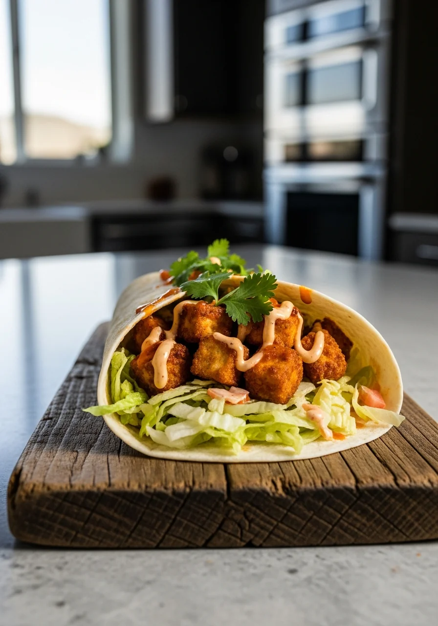 A vibrant buffalo tofu wrap paired with a creamy, easy ranch dressing—spicy, tangy, and perfect for a quick, wholesome meal any day of the week.