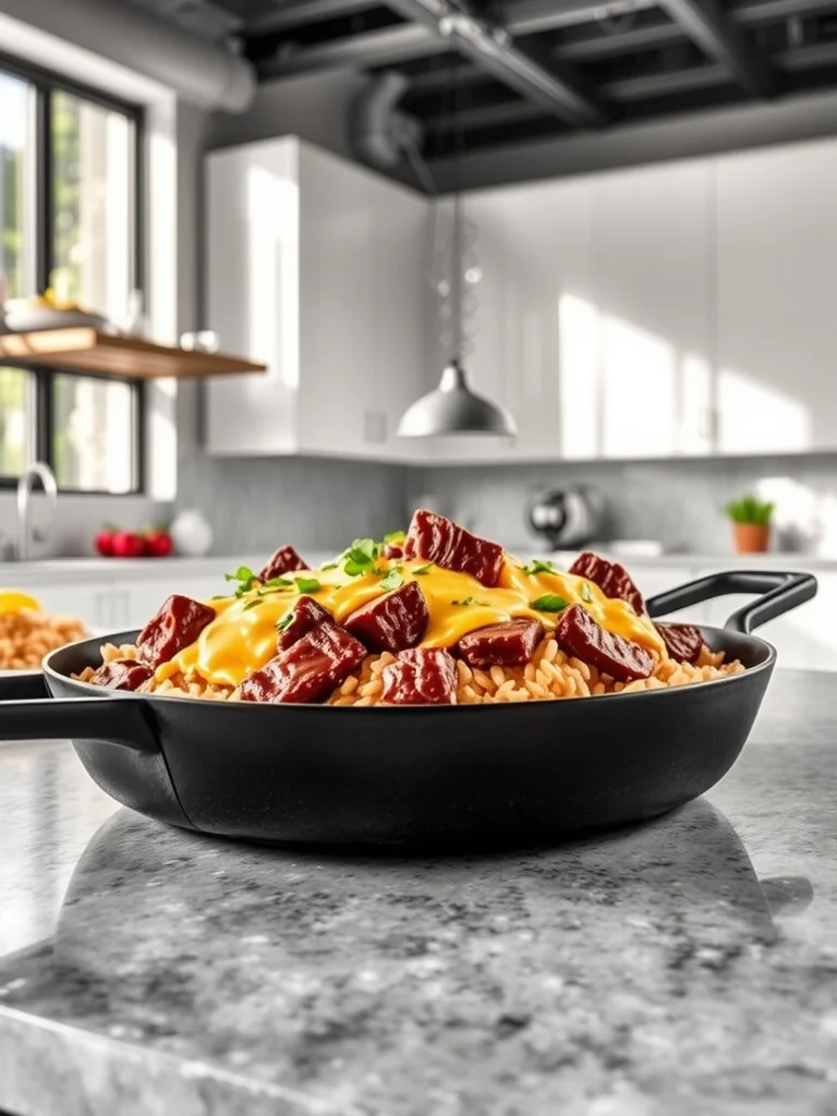 A hearty, cheesy steak and rice skillet that brings together tender strips of beef, fluffy rice, and melted cheese in a single pan for a comforting dinner that feels like a warm hug after a long day.