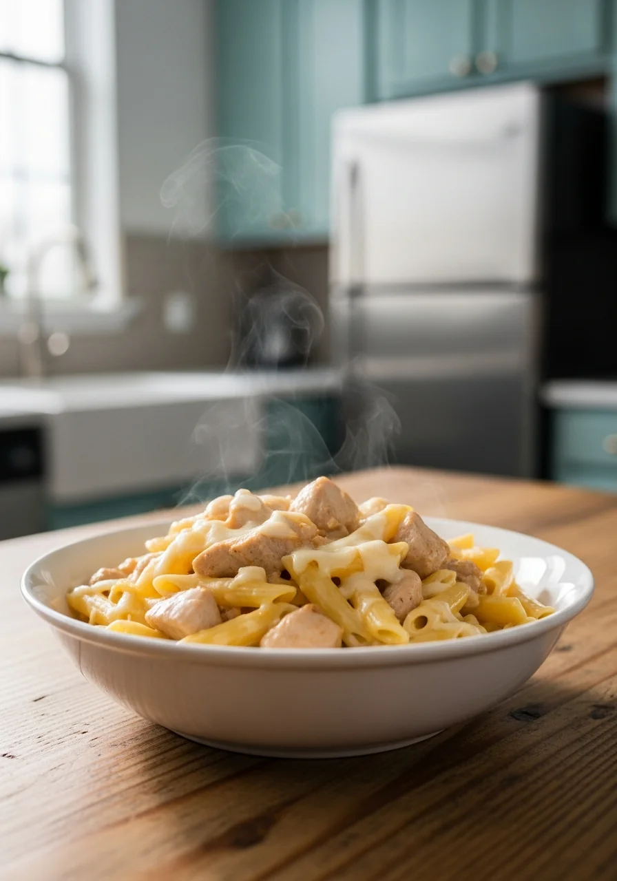 A warm bowl of penne tossed in a creamy, cheesy sauce dotted with tender chicken, perfect for a cozy dinner that feels like a gentle hug on a chilly evening.