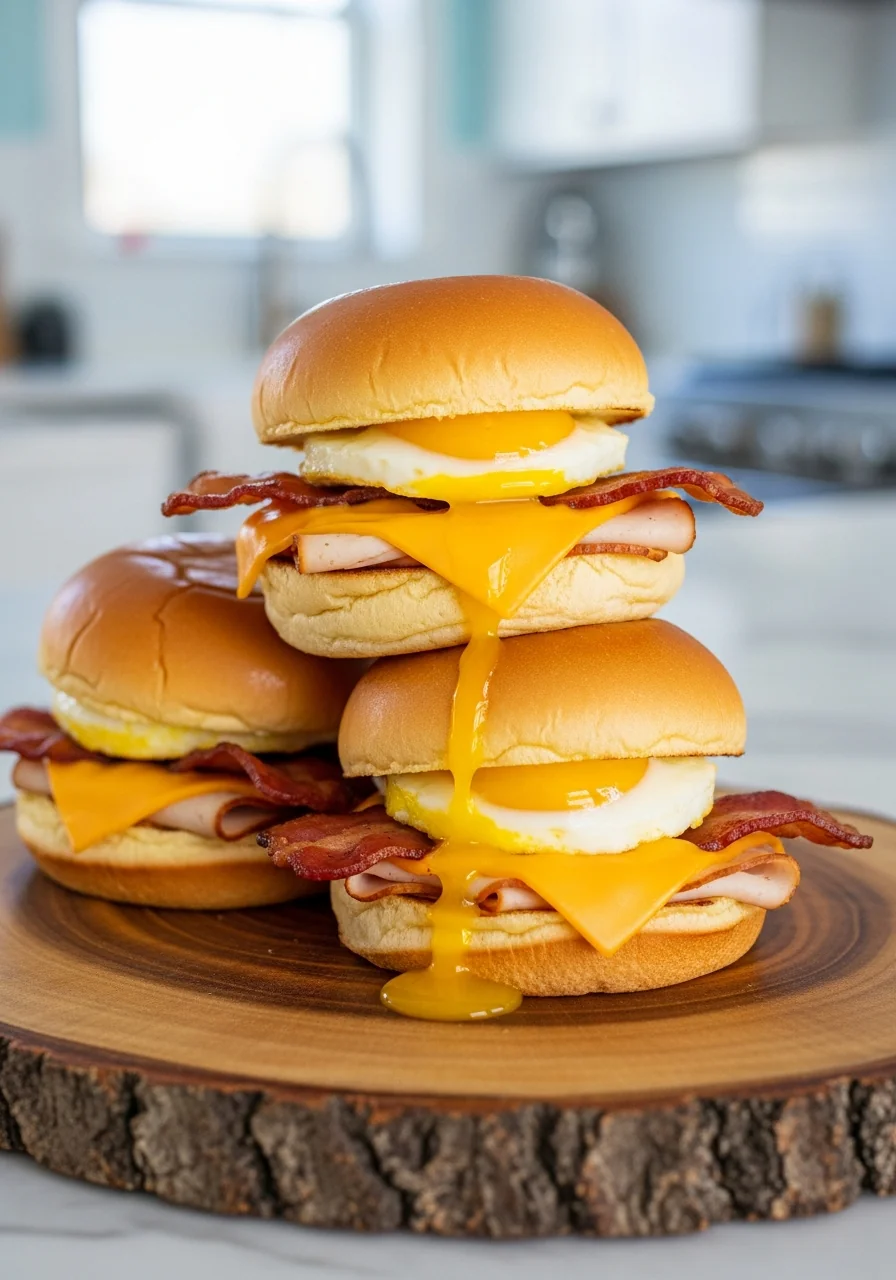 These fluffy breakfast sliders are a handheld delight, layered with crisp turkey bacon, a soft scrambled egg, and melted cheese, all hugged by a buttery roll that makes every bite feel like a warm sunrise on your plate.