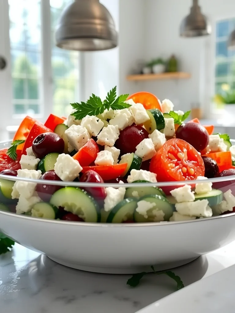 A bright, crisp Greek cucumber salad with juicy tomatoes, briny olives, and creamy feta, tossed in a lemon‑olive oil dressing—perfect for a light, refreshing meal.