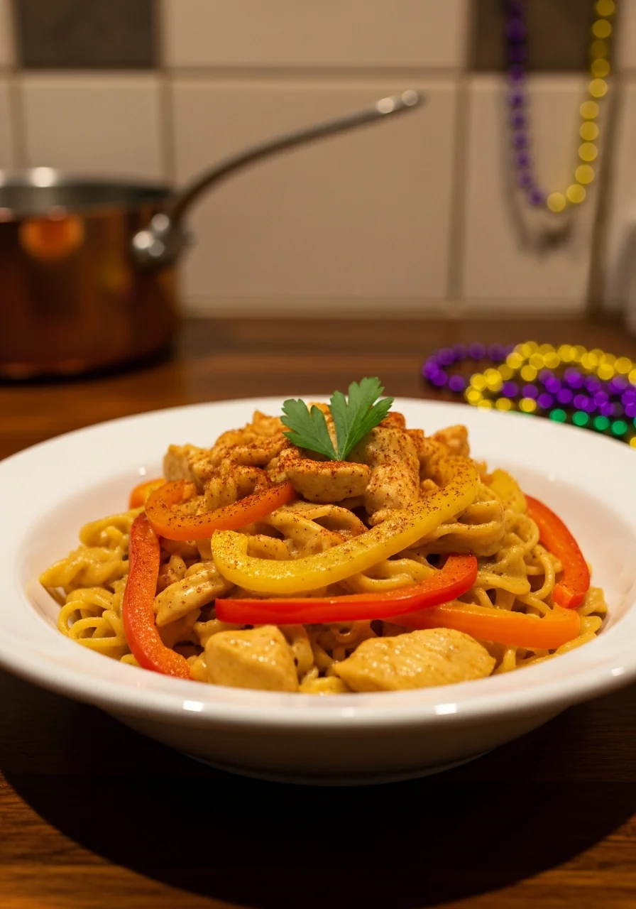 A vibrant, spicy Cajun‑inspired pasta that captures the spirit of Mardi Gras with tender chicken, colorful peppers, and a creamy, peppery sauce that hugs every noodle.