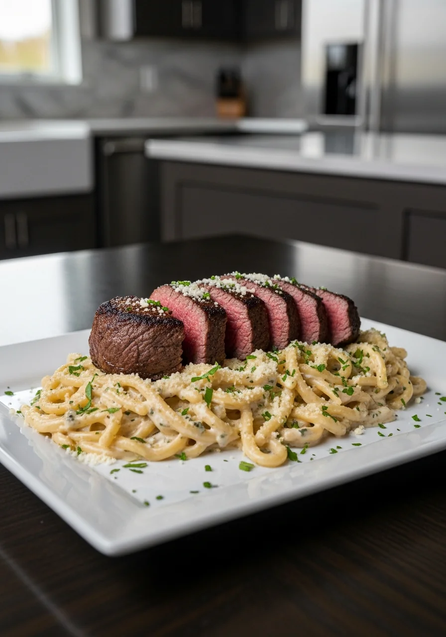 A comforting bowl where tender steak meets a silky, garlic pasta, perfect for a cozy evening.