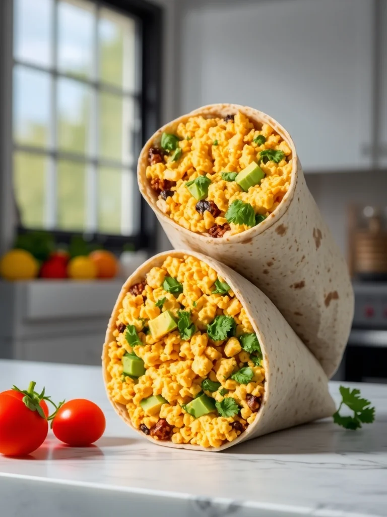 A hearty vegan high-protein tofu scramble wrapped in a warm tortilla, perfect for a quick, nutritious breakfast that feels like a cozy hug.