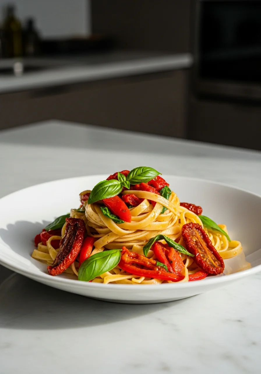 A bright, comforting pasta that brings the deep, sweet flavor of sun‑dried tomatoes together with fresh veggies and al dente noodles, all without a single animal product.