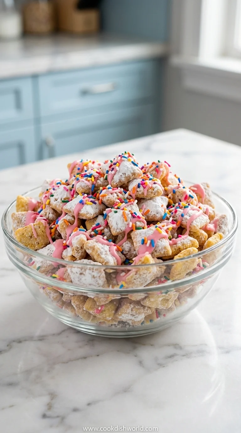 A sweet, crunchy celebration snack that blends the buttery goodness of traditional puppy chow with the bright flavors of birthday cake – perfect for party tables or a cozy treat.