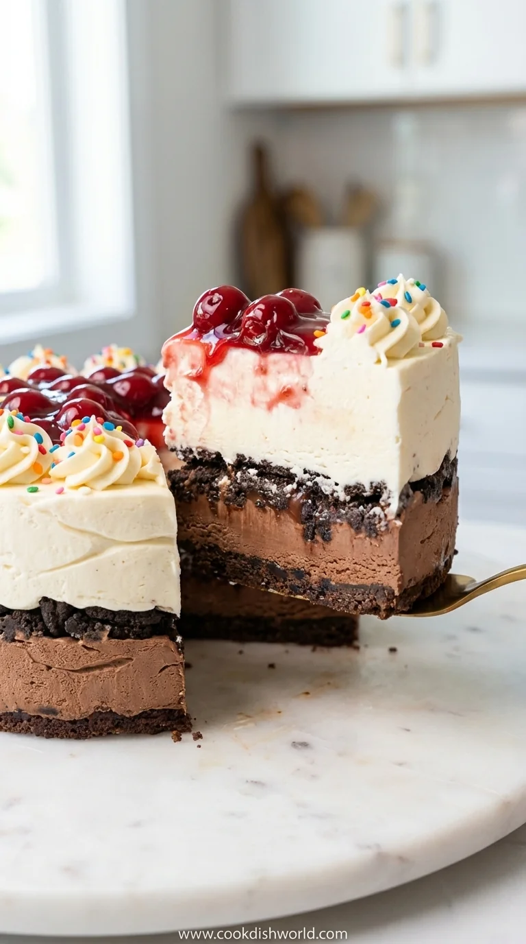 When you pull the cake from the freezer, the edges may look a little frosty—just let it sit a brief moment. This pause lets the outer whipped topping soften just enough to slice cleanly, and you’ll notice the faint scent of vanilla rising, reminding you why this dessert feels like a celebration every time.